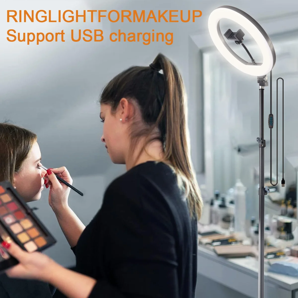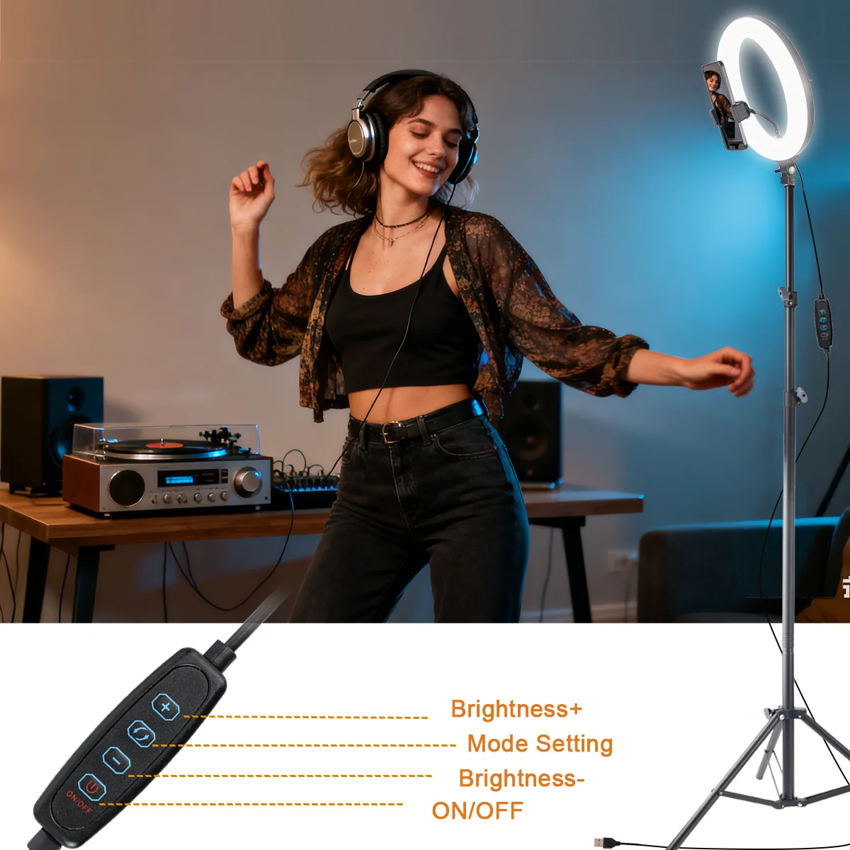Achieve professional-quality lighting with this Professional Ring Light Tripod, designed for studio and home content creation. The 10-inch ring light features three color lighting modes and ten dimming levels, allowing you to customize brightness and tone for any shooting environment. Paired with a dismountable tripod that extends up to 180cm (70 inches), it offers flexible height adjustment for standing or seated setups. The stable tripod provides reliable support for recording videos, taking photos, or live streaming. Ideal for YouTube, makeup tutorials, online classes, and photography, it delivers even, shadow-free illumination. Lightweight and portable, the setup is easy to assemble, disassemble, and transport. This versatile lighting kit enhances image quality and brings a polished, professional look to your content.
